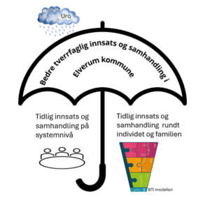 I Elverum kommune er det etablert en tverrsektoriell styringsgruppe bestående av sektorledere fra henholdsvis skole, barnehage, helse, mestring og omsorg, kultur og Nav. Styringsgruppen har overordnet ansvar for å påse at kommunen arbeider med tverrfaglig samhandling.